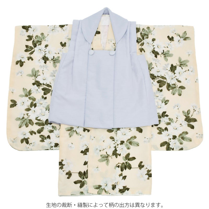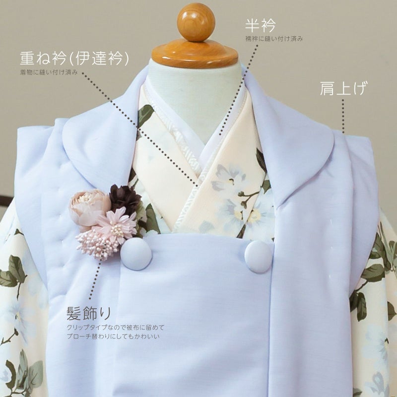 長襦袢・半衿(縫い付け済)・着物(腰ひも付き)・重ね衿(縫い付け済)・被布コート・巾着・草履・髪飾り・化粧箱のセットです。