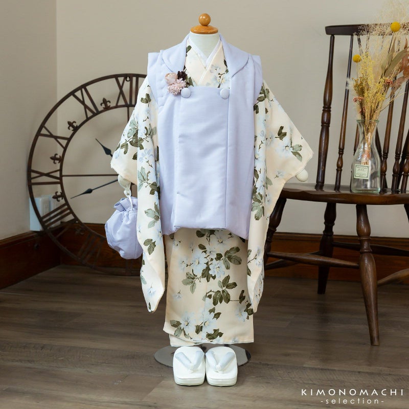 被布コートは淡いブルーラベンダー色、横に節の入ったシャンタン風の生地。くるみボタンの被布飾りがついています。着物はやや赤みの淡いクリーム色の地にグレーの陰影の入った白い花、モスグリーンの葉のマーガレット風の花模様。重ね衿はクリーム色。長襦袢は淡いピンク色に紗綾型の地模様。白い半衿が付いています。巾着は被布と共生地。淡いピンクベージュ、ブラウン系のコサージュ髪飾り。草履は白い台にごく淡いブルーグレーの鼻緒。