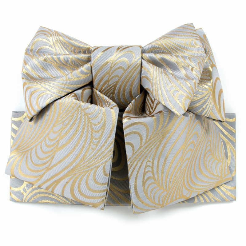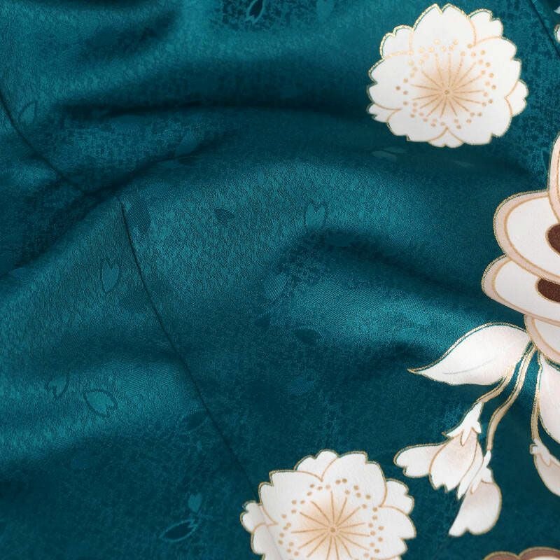 流水や熨斗、菊や桜などを描き、ブルグリーンとベージュ系でまとめた、大人っぽくてお洒落なお着物。帯はグレー地に金の流水。帯と共布のバッグと筥迫セット。しごきと帯締めと帯揚げはクリーム色。草履は薄グレーの台に帯と共布の鼻緒。