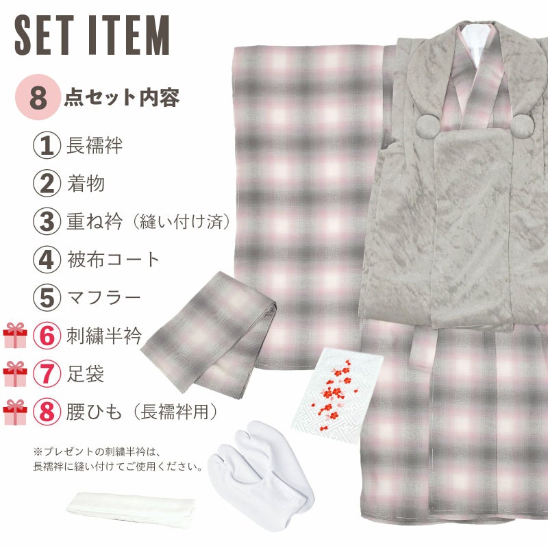 【商品内容】長襦袢・着物・重ね衿(縫い付け済)・被布コート・マフラー・刺繍半襟(プレゼント)・足袋(プレゼント)・腰ひも1本(プレゼント)の計8点