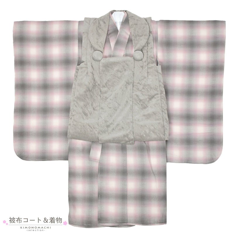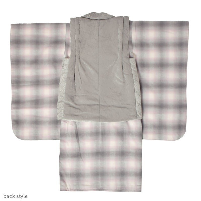 着物は起毛したネル生地。グレー、淡いピンク、白のぼかしたようなオンブレ・チェック。共布の重ね衿が付いています。