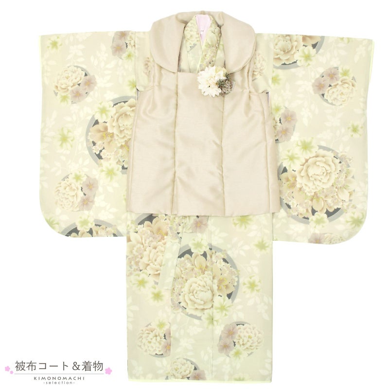 女の子の七五三に!3歳から着られる被布セットです。お着物には重ね衿が縫い付けられています。オシャレで女の子らしく華やかなデザイン。七五三だけでなく、お正月やひな祭りの節句にも。