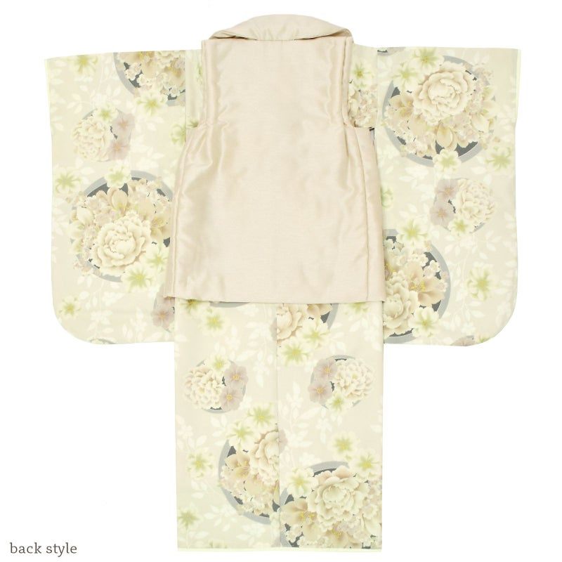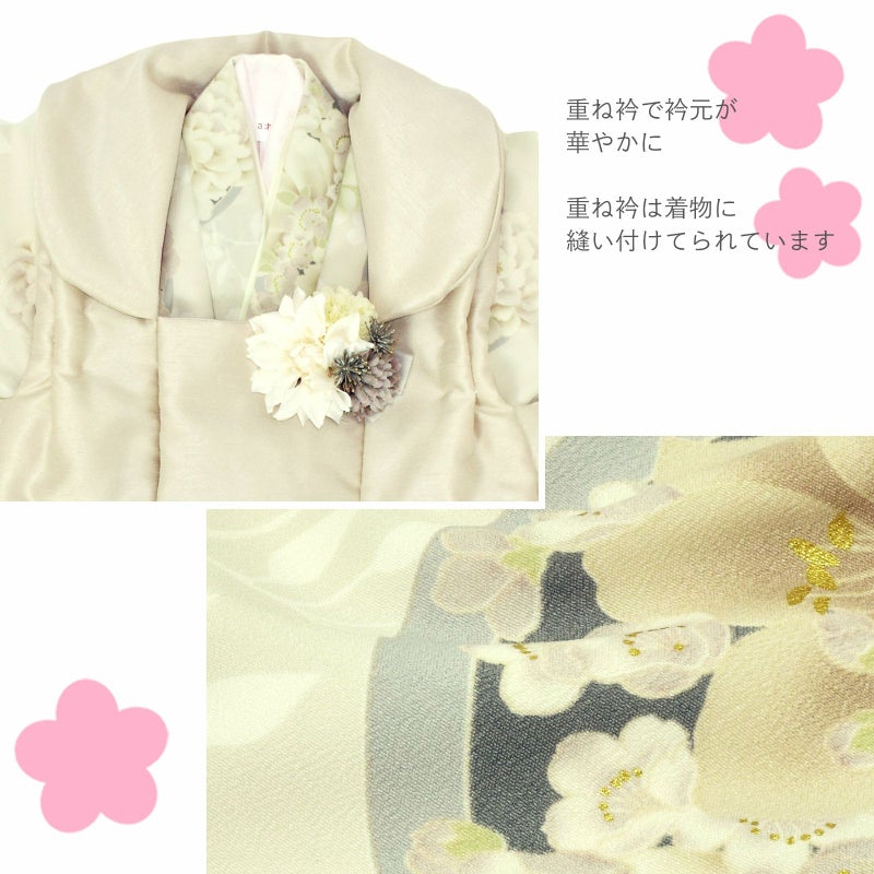 着物は淡いベージュの地に白のお花、グレーの丸紋に薄グリーンやベージュ系の牡丹や桜の花。ポイントにゴールドが入っています。重ね衿は淡いクリーム色。長襦袢は薄ピンク。