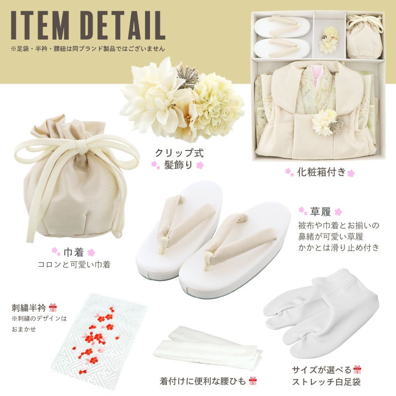 【商品内容】長襦袢・着物・重ね衿(縫い付け済)・被布コート・巾着・草履・髪飾り・刺繍半襟(プレゼント)・足袋(プレゼント)・腰ひも2本(プレゼント)の計10点