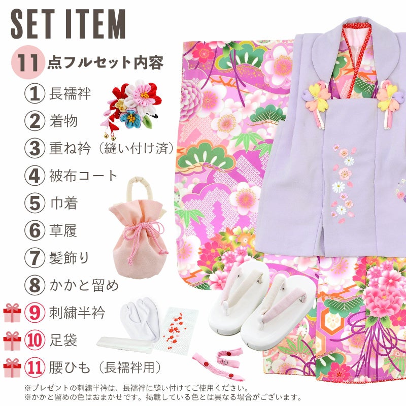 【商品内容】長襦袢・着物・重ね衿(縫い付け済)・被布コート・巾着・草履・髪飾り・かかと留め・刺繍半襟(プレゼント)・足袋(プレゼント)・腰ひも1本(プレゼント)の計11点