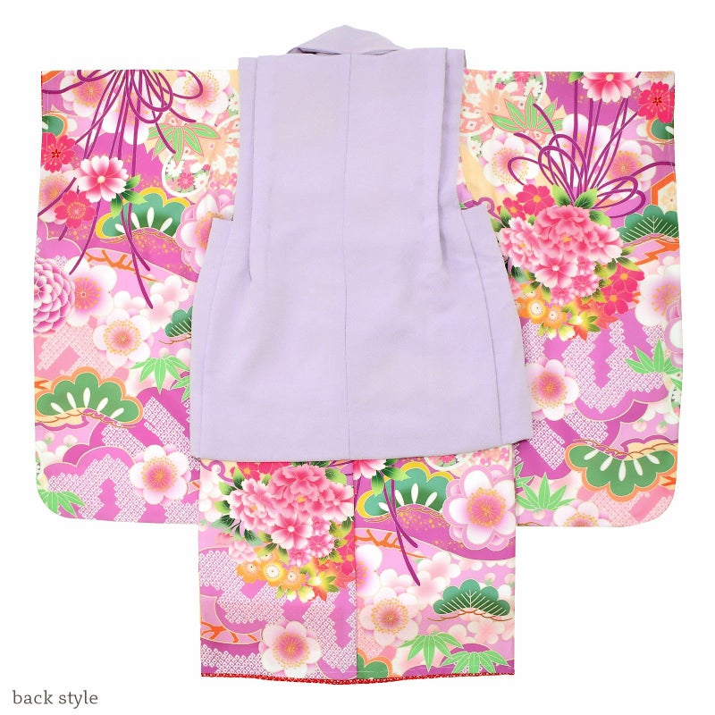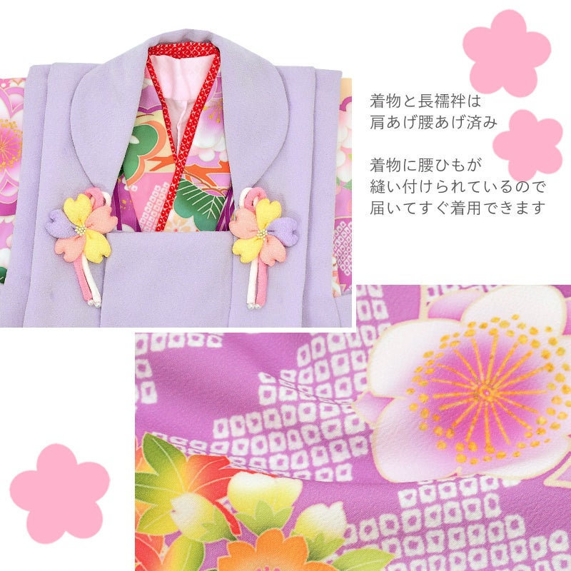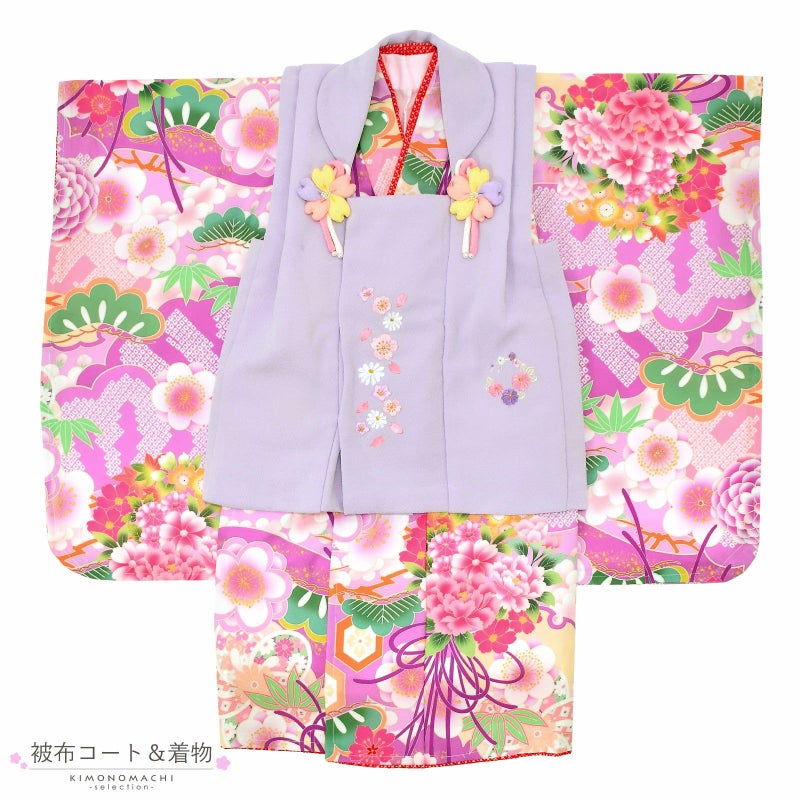 被布コートはややグレイッシュな明るい藤色の地にピンクや薄紫色の桜や花の丸の刺繍。薄ピンクや黄色のつまみの桜の被布飾り。着物は浅い赤紫色の地に、鮮やかなピンクのくす玉、薄ピンク、緑、淡い青の松竹梅に橙色の亀甲など。ふき、重ね衿は赤い鹿の子模様。薄ピンクの長襦袢。