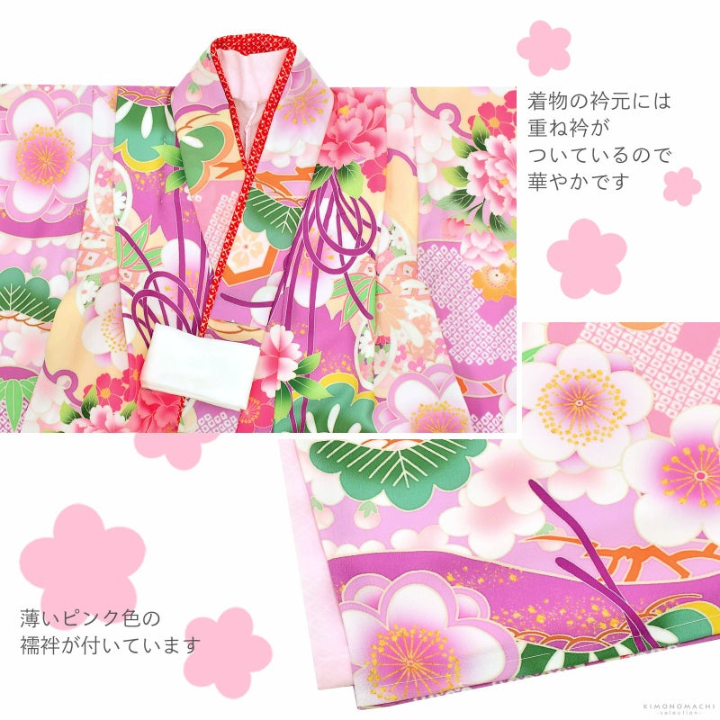 女の子の七五三に!3歳から着られる被布セットです。お着物には重ね衿が縫い付けられています。オシャレで女の子らしく華やかなデザイン。七五三だけでなく、お正月やひな祭りの節句にも。