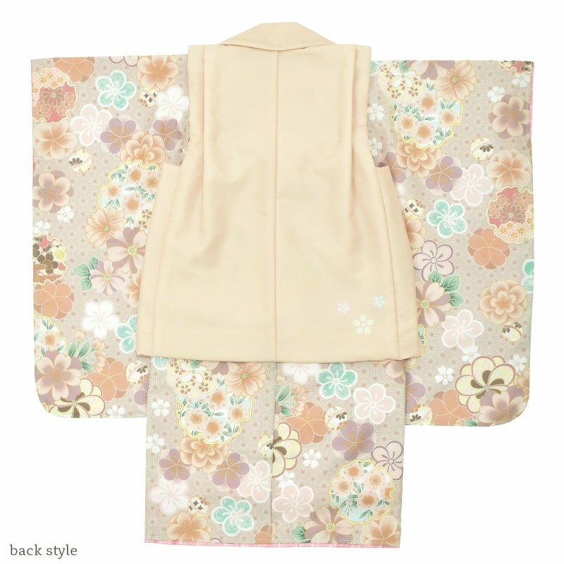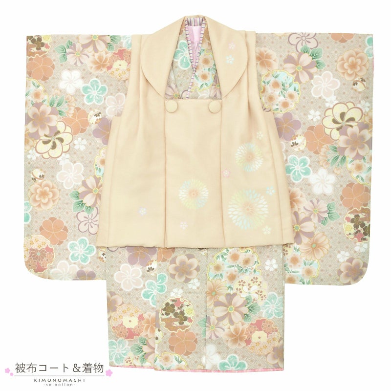 被布コートはエクルベージュの地、白に淡いピンク、水色ぼかしのむじな菊と梅。着物はベージュの麻の葉模様の地に、梅や桜の花紋が詰まったクリーム色の雪輪、ねじ梅、鈴。アプリコット、バニラ、ピンクベージュに淡い緑やミントブルーの配色。ふきはピンク。重ね衿はクリーム色に藤色、ピンク、水色の段模様。薄ピンクの長襦袢。