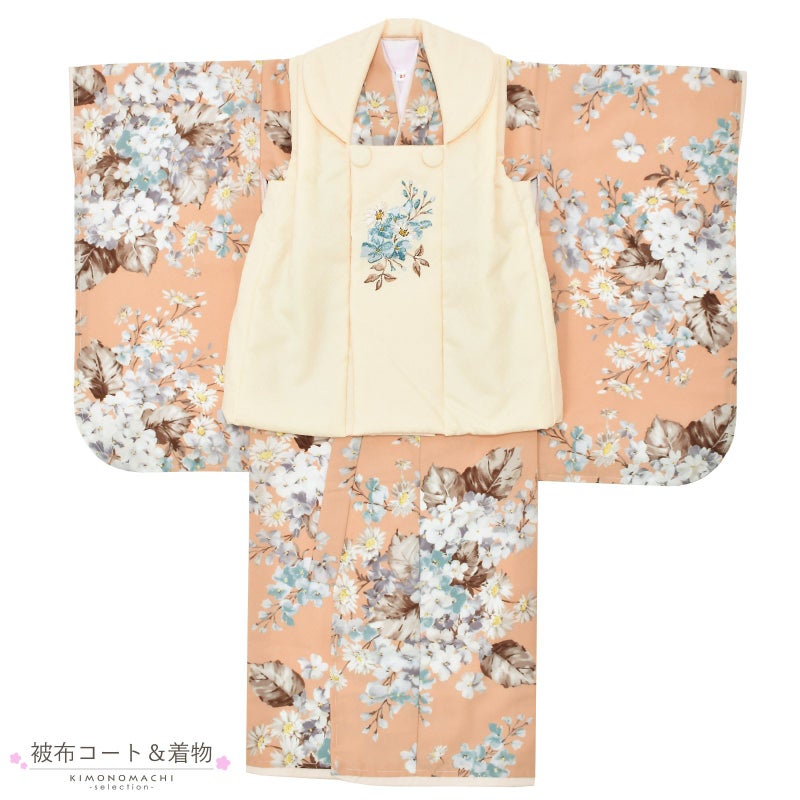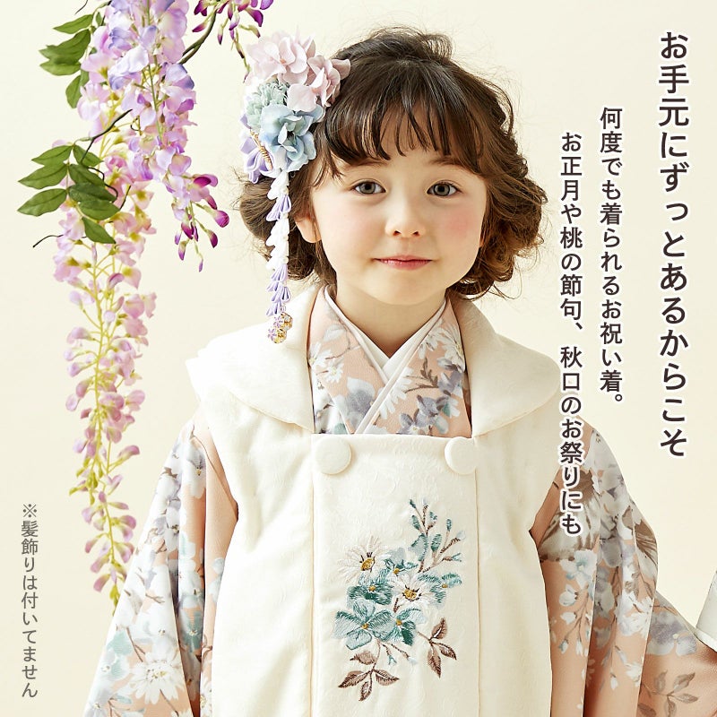 女の子の七五三に!3歳から着られる被布セットです。お着物には重ね衿が縫い付けられています。オシャレで女の子らしく華やかなデザイン。七五三だけでなく、お正月やひな祭りの節句にも。