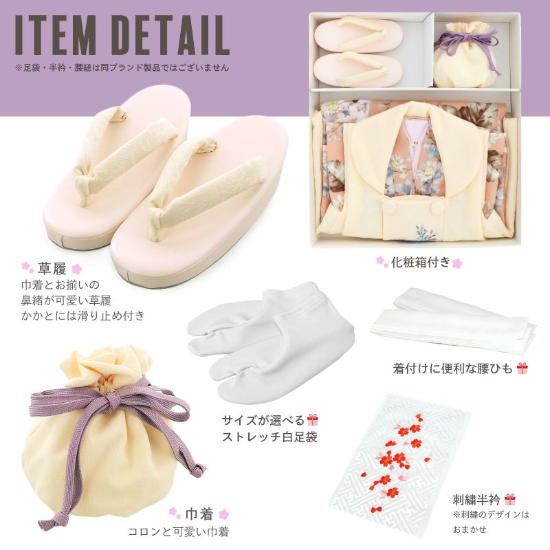 【商品内容】長襦袢・着物・重ね衿(縫い付け済)・被布コート・巾着・草履・刺繍半襟(プレゼント)・足袋(プレゼント)・腰ひも2本(プレゼント)の計9点