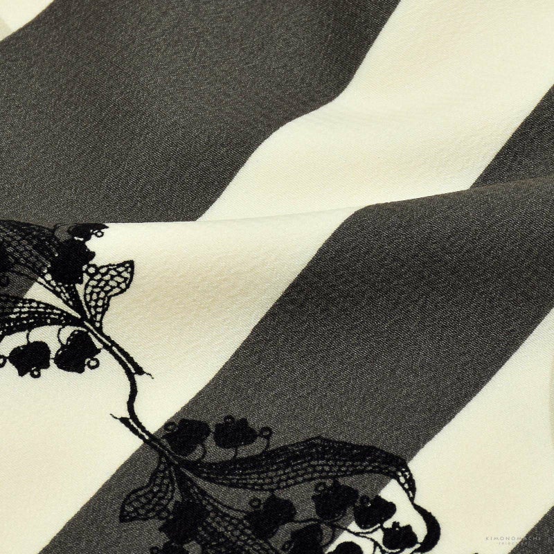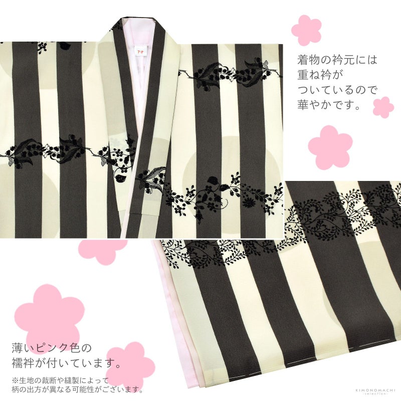 着物はアイボリーの地にベージュの大きなドット、その上に濃いグレーのストライプ。黒のスズランなど草花のレース模様が横に描かれています。ごく淡いピンクの重ね衿。白に淡いグレーのレースの付いた裾よけ。薄ピンクの長襦袢。