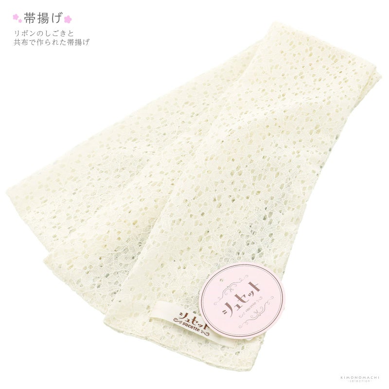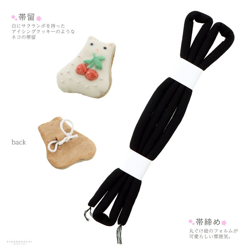 帯揚げはオフホワイトのお花のレース。帯揚げと共布のリボンのしごき。帯締めは黒。白にサクランボを持ったアイシングクッキーのようなネコの帯留。白のレース編みの飾り衿。