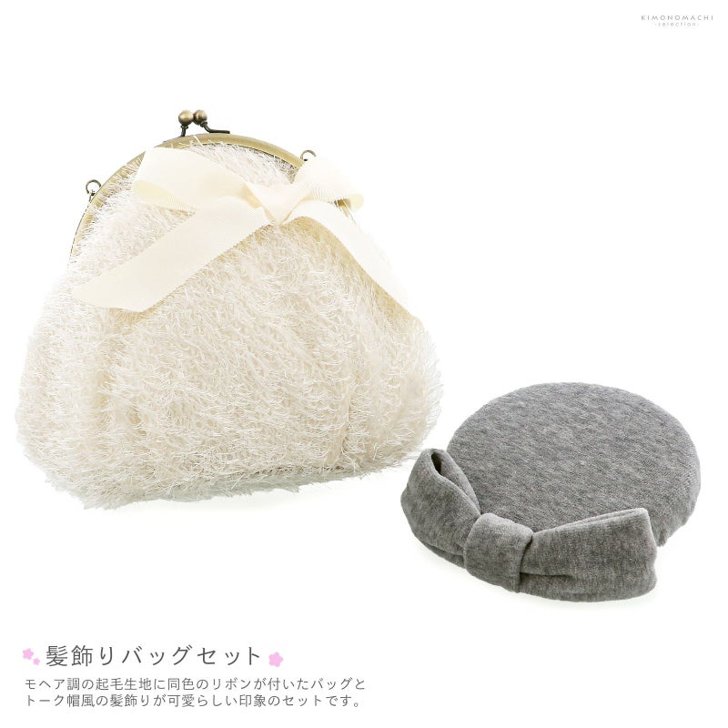 バッグは白のモヘア調の起毛の生地にアンティークゴールドの口金。オフホワイトのリボンが付いています。グレーのリボンの付いたトーク帽風の髪飾り。