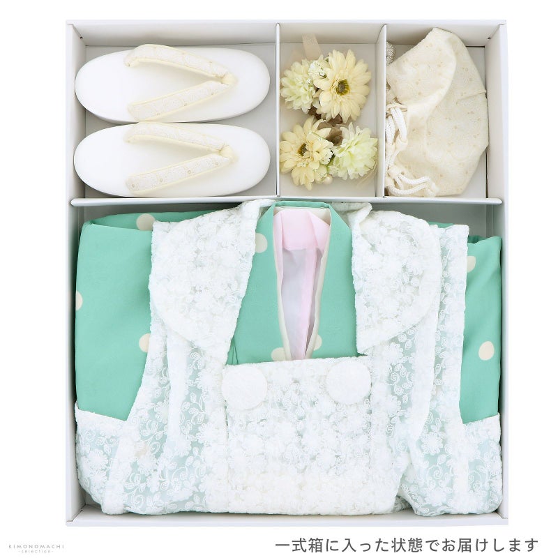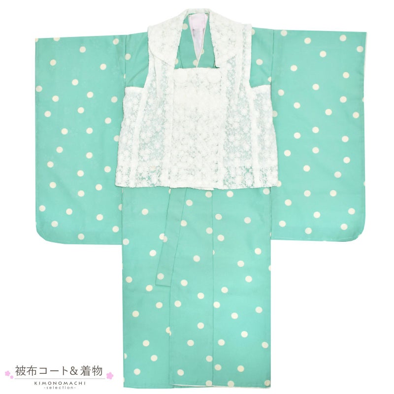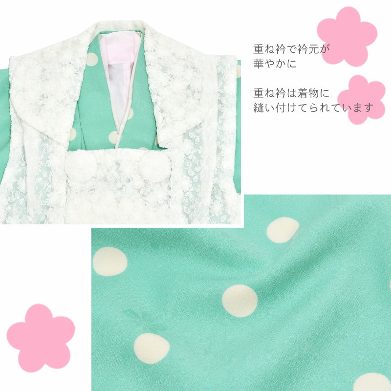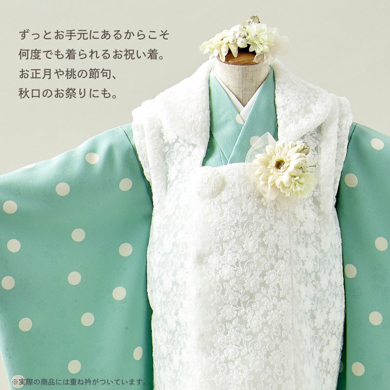 被布コートはオーガンジーの地に白のお花の刺繍レース。くるみボタンの被布飾り。着物は桜の地模様にややグレイッシュなウォーターグリーンの地に、白のランダムなポルカドット。重ね衿は淡いエクルベージュ。長襦袢は薄ピンク。巾着は白地にベージュのペイズリー柄の刺繍レース。草履は巾着と共生地の鼻緒に白の台。オフホワイト系のガーベラやパール、チュールのコサージュ2点。