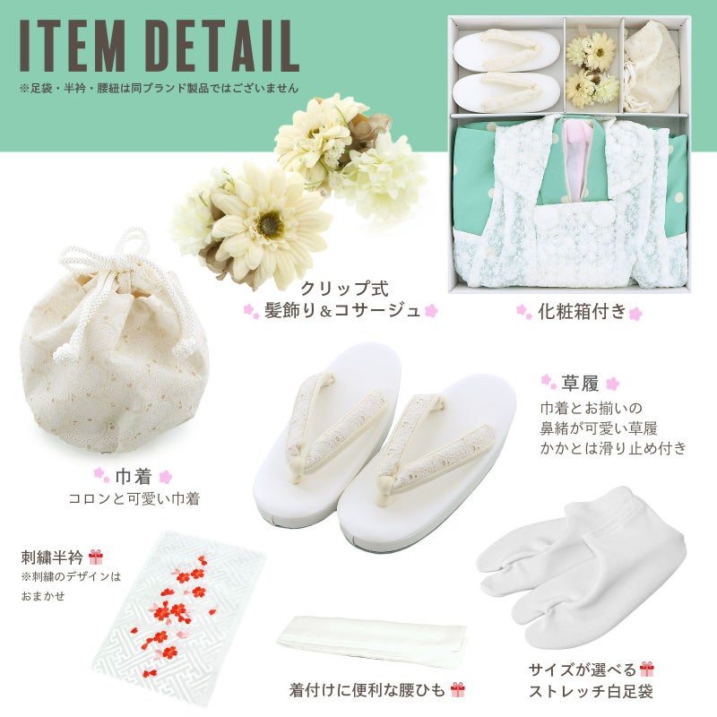 【商品内容】長襦袢・着物・重ね衿(縫い付け済)・被布コート・巾着・草履・髪飾り・コサージュ・刺繍半襟(プレゼント)・足袋(プレゼント)・腰ひも1本(プレゼント)の計11点