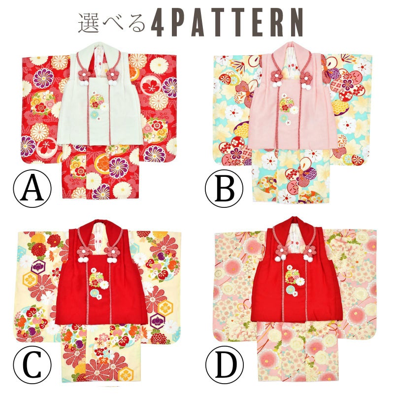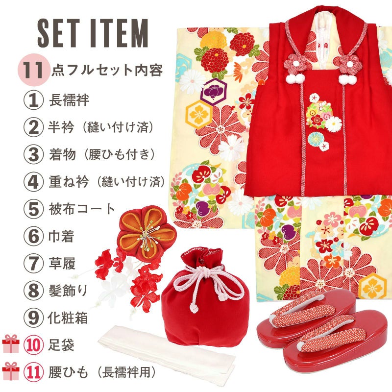 【商品内容】長襦袢・半衿(縫い付け済)・着物(腰ひも付き)・重ね衿(縫い付け済)・被布コート・巾着・草履・髪飾り・化粧箱・足袋(プレゼント)・腰ひも1本(プレゼント)の11点セット