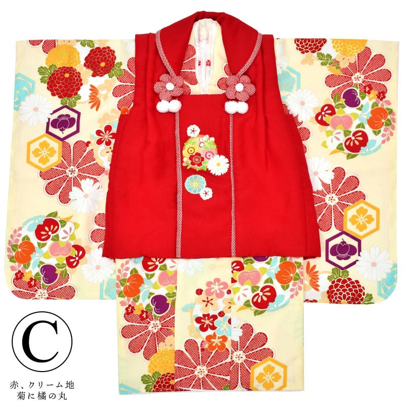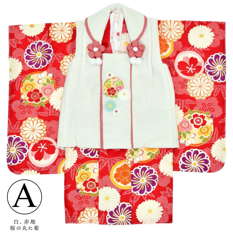 被布コートは赤地に桜の丸や花々の刺繍。衿周りに赤の七宝模様のふち取り。つまみのお花とファーのポンポンの被布飾りがついています。着物は桜の地模様、クリーム色地に赤の疋田の菊紋。赤、白、くすんだ桃色に水色、橙、紫の配色の橘の丸や八重菊、梅の花の丸。ポイントに金彩。重ね衿はごく淡いピンク。淡いエクルベージュ地に赤や水色のお花の刺繍半衿。薄ピンクの紗綾型の地模様の長襦袢。赤色系の草履。巾着は赤地に赤の七宝模様の見返し。