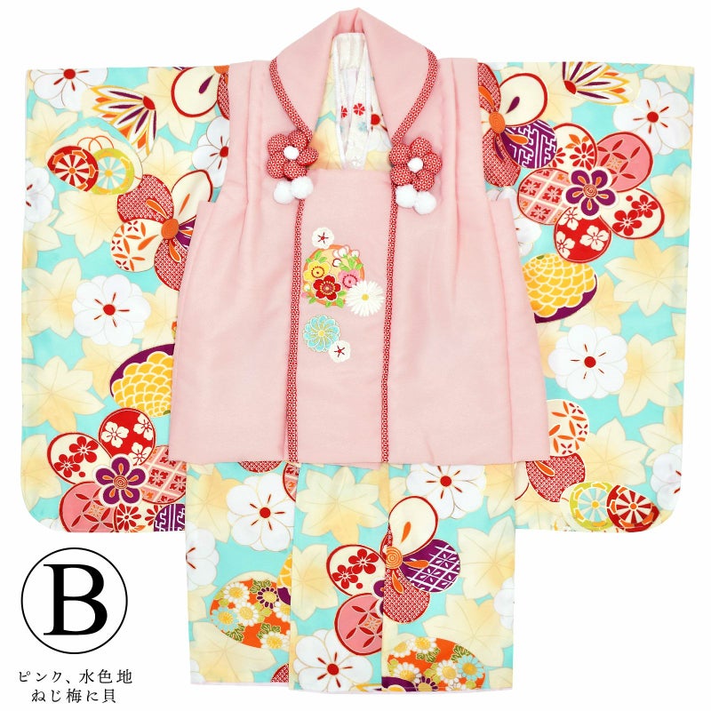被布コートは淡いピンクの地に桜の丸や花々の刺繍。衿周りに赤の七宝模様のふち取り。つまみのお花とファーのポンポンの被布飾りがついています。着物は桜の地模様、水色地に淡い生成り色の楓。その上に、赤やピンク、紫のねじ梅、橙や山吹色、紫の貝合わせ模様。ポイントに金彩。重ね衿はごく淡いピンク。淡いエクルベージュ地に赤や水色のお花の刺繍半衿。薄ピンクの紗綾型の地模様の長襦袢。赤色系の草履。巾着はピンク地に赤の七宝模様の見返し。