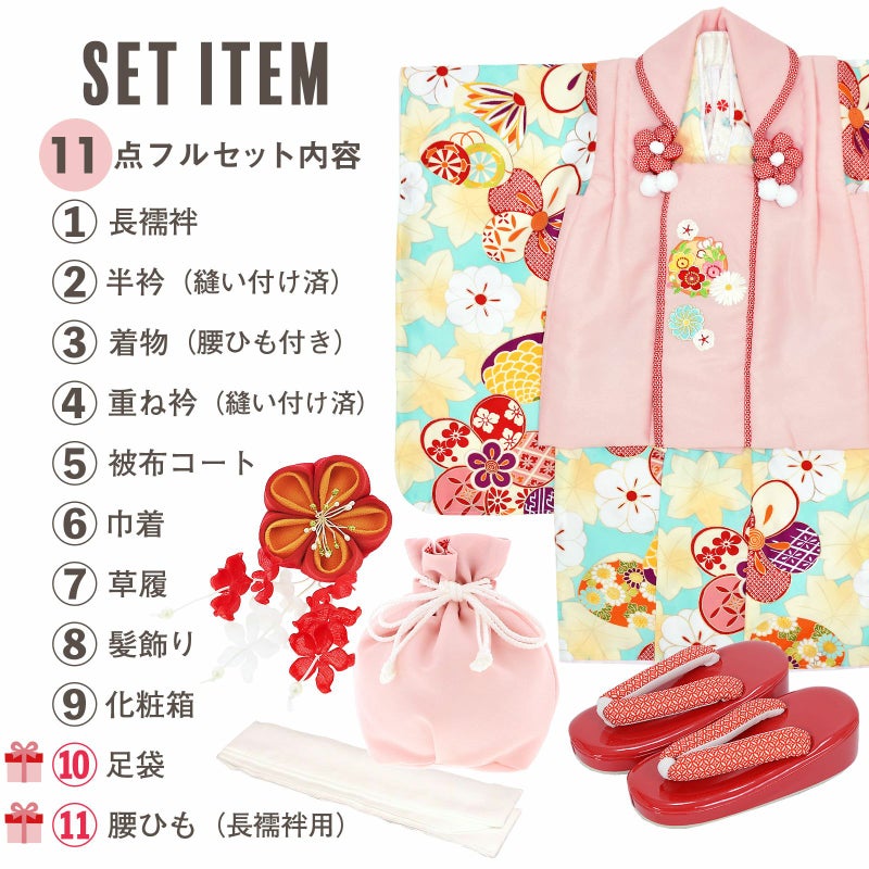 【商品内容】長襦袢・半衿(縫い付け済)・着物(腰ひも付き)・重ね衿(縫い付け済)・被布コート・巾着・草履・髪飾り・化粧箱・足袋(プレゼント)・腰ひも1本(プレゼント)の11点セット