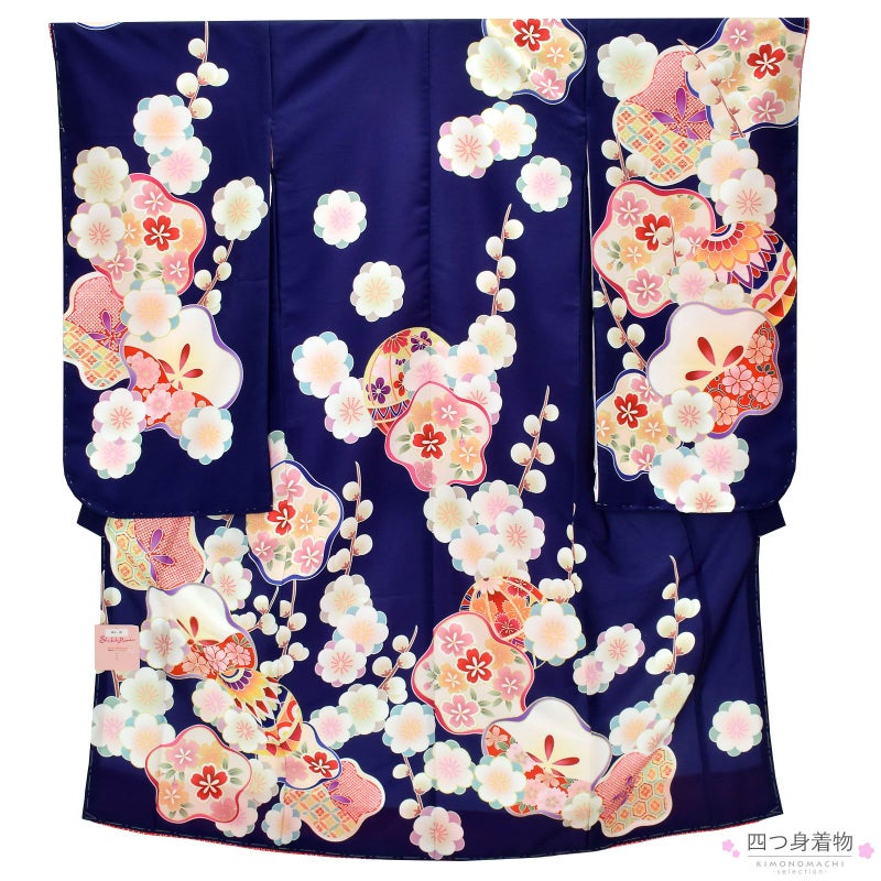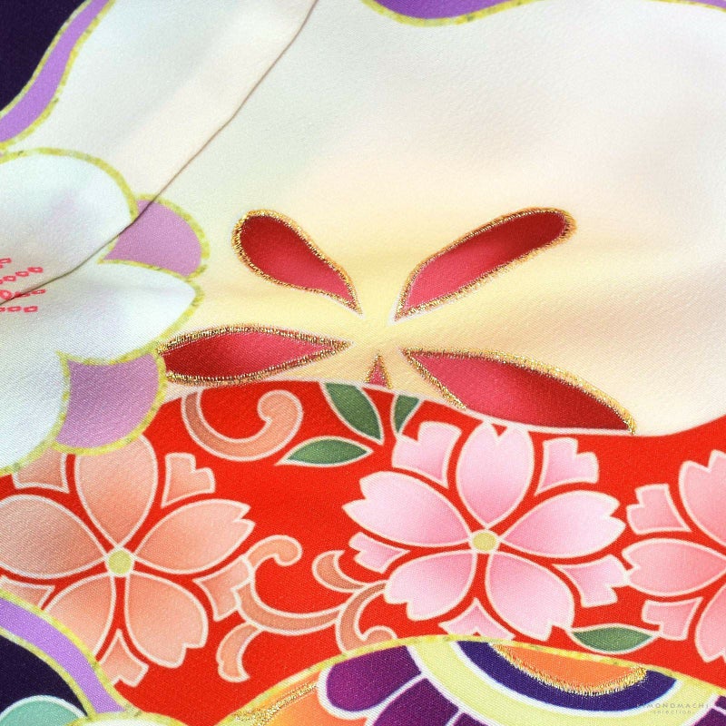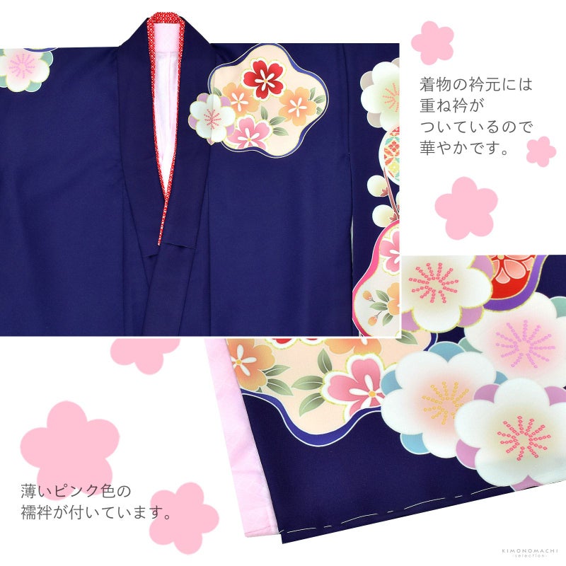 着物はやや紫色みの紺地。青紫や藤色、赤紫の線で表現された光琳梅に、桜や亀甲、疋田などの文様が詰まっています。赤、薄緑、山吹色にピンク、紫などの配色の手毬に八重梅、枝梅などが可愛らしく華やかな印象。ポイントにゴールドの刺繍。重ね衿は赤の疋田。薄ピンクの疋田の地模様の長襦袢。