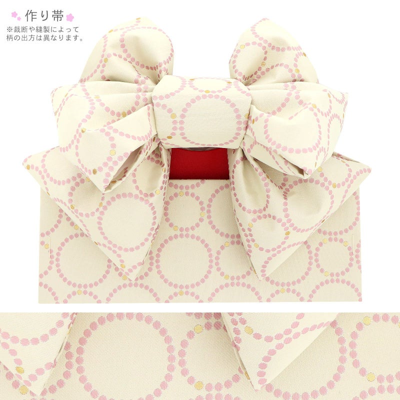 帯はベージュの地にピンクとゴールドのドットが並んだ水玉模様。