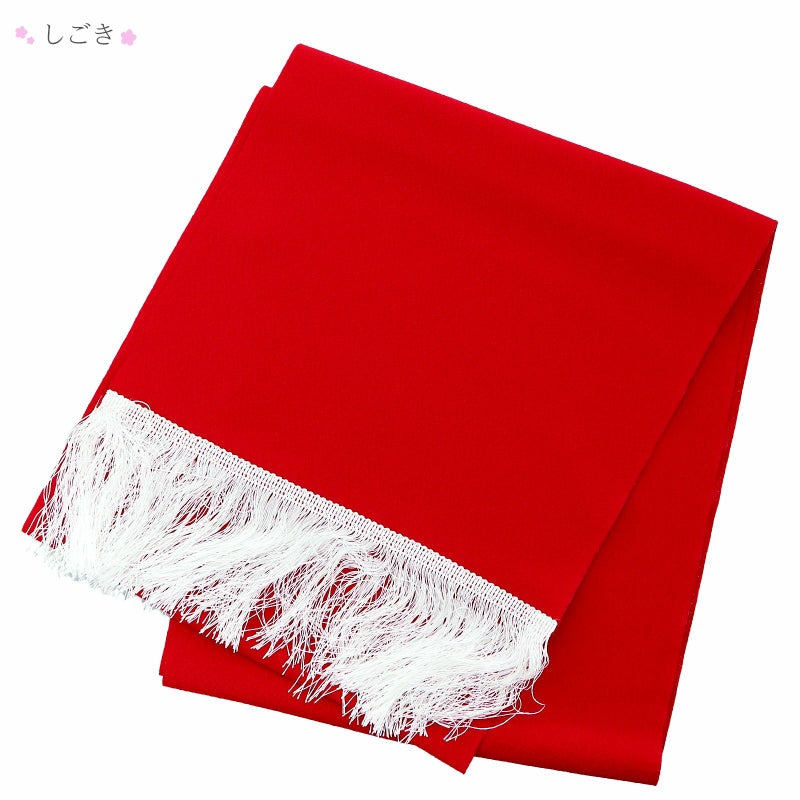 帯揚げとしごきははっきりとした赤。端に白のフリンジ。