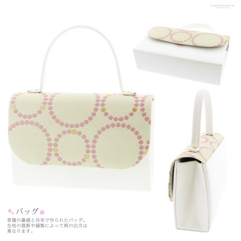 草履の鼻緒とバッグの蓋は、ベージュの地にピンクとゴールドのドットが並んだ水玉模様。バッグの本体と持ち手、草履の台は白。筥迫はバッグと共生地。くすんだ濃い桃色の帯締め。銀のビラカン。白の末広、紅白の房飾り。