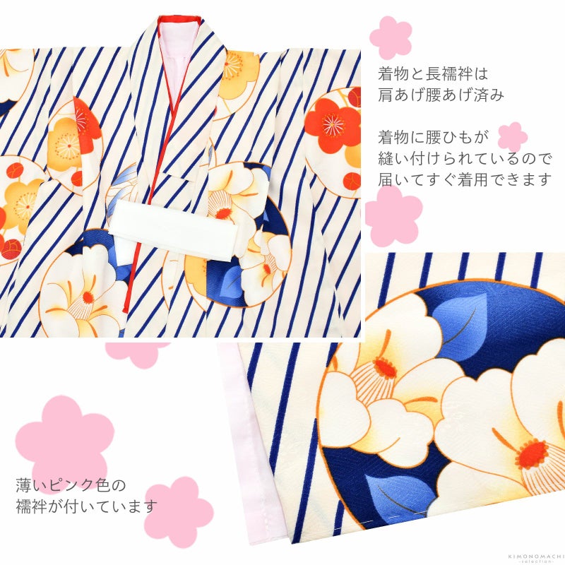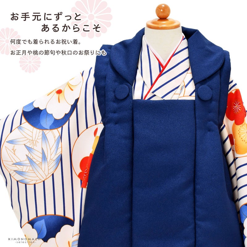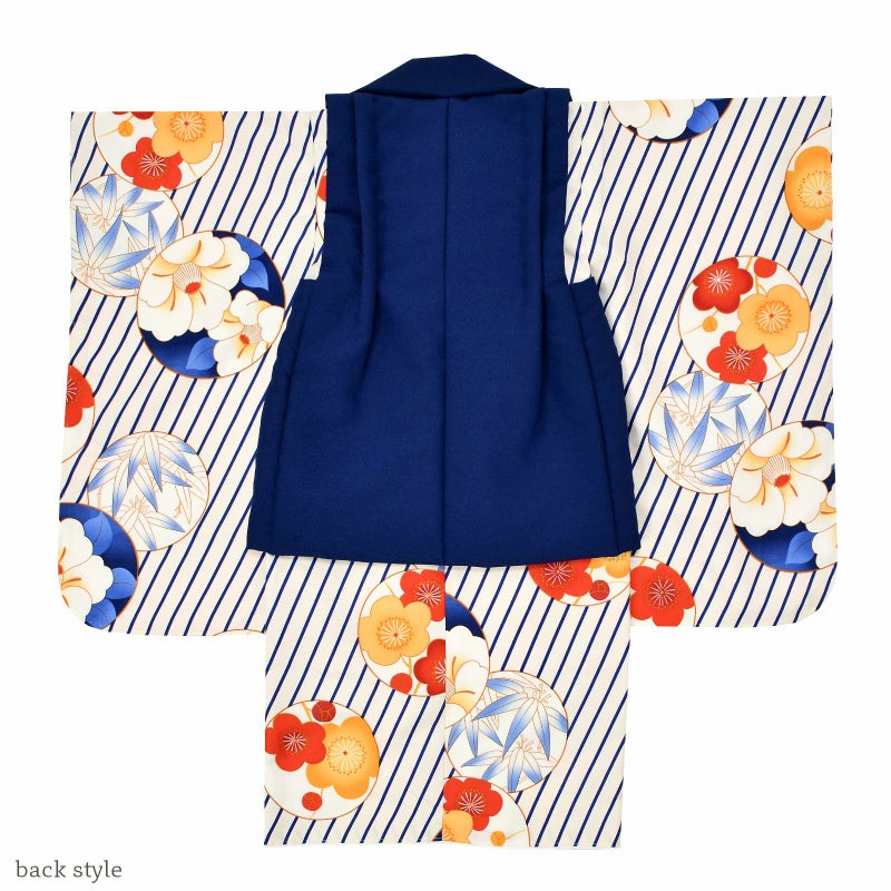 被布コートは紺色。くるみボタンの被布飾り。着物はオフホワイトの地に、紺の斜めストライプ、橙色の丸に朱色や橙色の梅、椿、笹など。重ね衿は赤。薄ピンクの長襦袢。草履は白の台に赤地の刺繍の鼻緒。着物と共布の巾着。