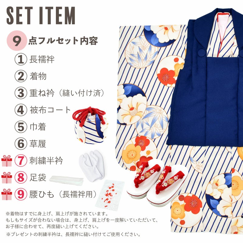 【商品内容】長襦袢・着物・重ね衿(縫い付け済)・被布コート・巾着・草履・刺繍半衿(プレゼント)・足袋(プレゼント)・腰ひも1本(プレゼント)の9点セット