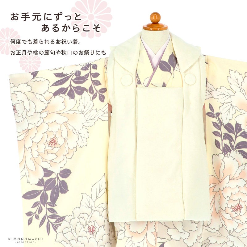 女の子の七五三に!3歳から着られる被布セットです。お着物には重ね衿が縫い付けられています。女の子らしく可愛くて華やかなデザイン。七五三だけでなく、お正月やひな祭りの節句にも。