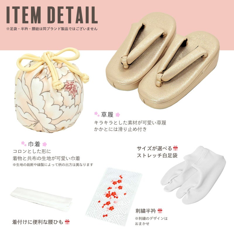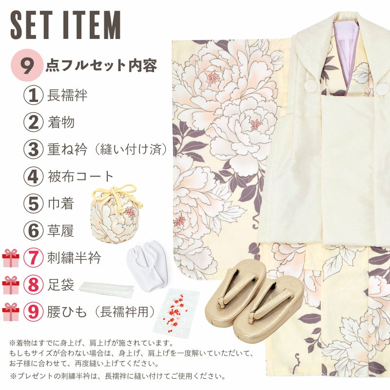 【商品内容】長襦袢・着物・重ね衿(縫い付け済)・被布コート・巾着・草履・刺繍半衿(プレゼント)・足袋(プレゼント)・腰ひも1本(プレゼント)の9点セット