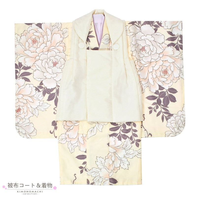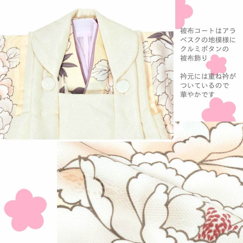 被布コートはオフホワイトに唐草の地模様。くるみボタンの被布飾り。着物は紗綾型の地模様のある明るい象牙色の地、金茶色の輪郭線に淡い桃色や淡いグレーの花びらの大輪の牡丹の花模様。重ね衿はくすみパープル。薄ピンクの長襦袢。草履はラメ感のあるブロンズゴールド。着物と共布の巾着。