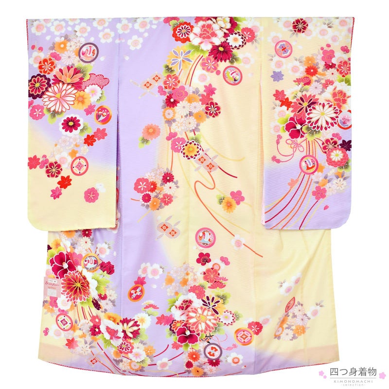 着物は紗綾形の地模様、クリーム色に藤色のぼかしの地。白に深い赤、オレンジやピンク、黄緑色の牡丹や椿、菊を組紐で束ねたくす玉。梅、菊や桜、楓に花の丸、宝尽くし紋。ポイントにゴールドの刺繍が豪華な印象。重ね衿は赤の疋田。薄ピンクの疋田の地模様の長襦袢。
