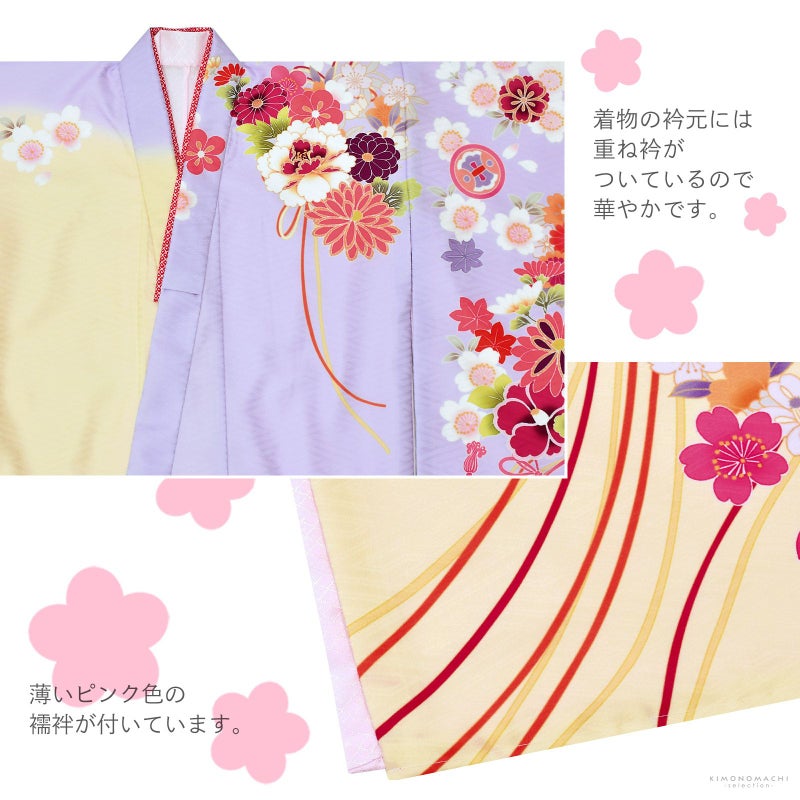 七歳の七五三のお着物(四つ身着物)のフルセットです。お着物には、重ね衿が縫い付けられています。女の子らしい可愛らしく華やかな色合い。
