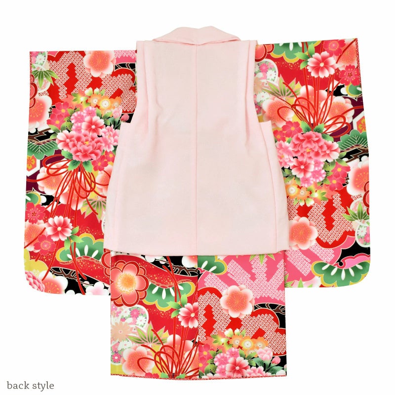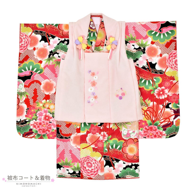 女の子の七五三に!3歳から着られる被布セットです。お着物には重ね衿が縫い付けられています。オシャレで女の子らしく華やかなデザイン。七五三だけでなく、お正月やひな祭りの節句にも。
