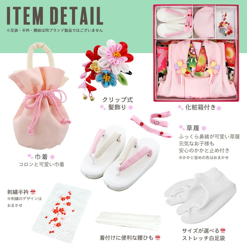 【商品内容】長襦袢・着物・重ね衿(縫い付け済)・被布コート・巾着・草履・髪飾り・かかと留め・刺繍半襟(プレゼント)・足袋(プレゼント)・腰ひも1本(プレゼント)の計11点