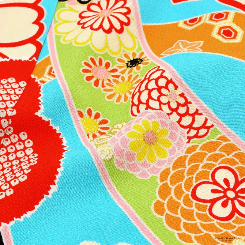 【色柄】はっきりとした明るい水色の地。全体に翻る黄緑や黒、橙色の蔓帯には赤やピンク、オレンジの花紋が表現されています。その上に、赤とアイボリーの大きな桜、楓、赤い鹿の子の梅の花が散らされています。