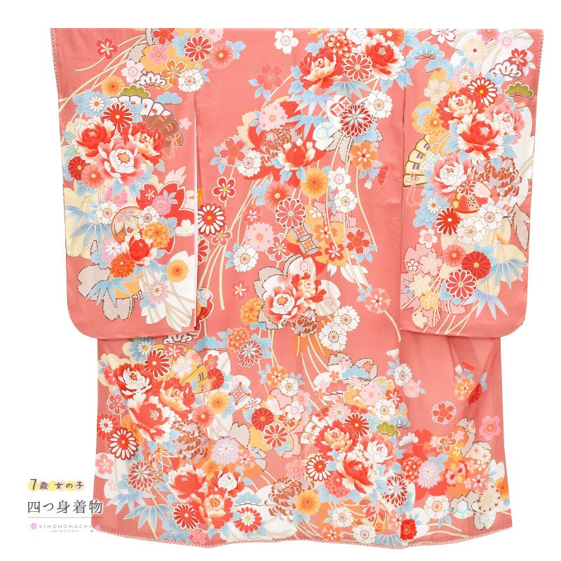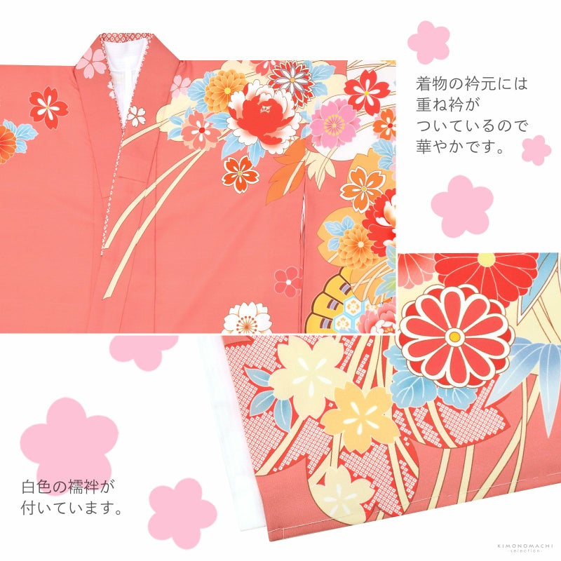 着物はややグレイッシュな赤みのピンクの地。檜扇にやわらかい赤のや濃いピンク、ブルーグレー、オレンジ、薄い黄色の牡丹や菊、桜に松竹などの花々、手鞠などが表現された愛らしい文様です。重ね衿やふきはくすみピンクに白の鹿の子。白の長襦袢。
