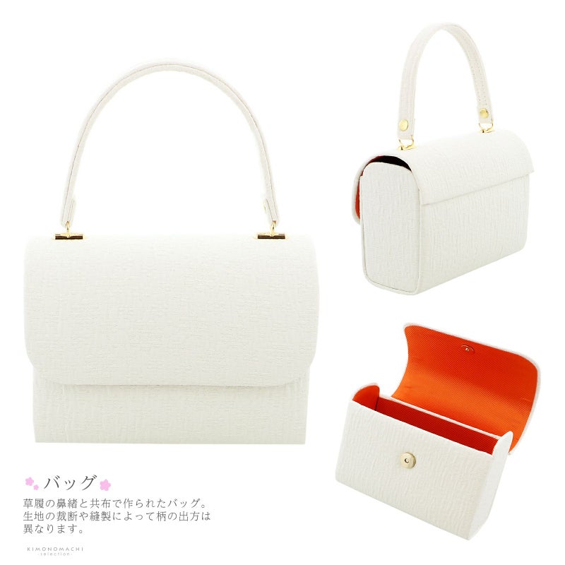 バッグと筥迫はオフホワイトの立体的な大小の梅鉢紋が織り出されたふくれ織り。草履は白の台にバッグと共布の鼻緒。淡いピンクの丸ぐけ。銀のビラカン。白の扇子や房飾り。