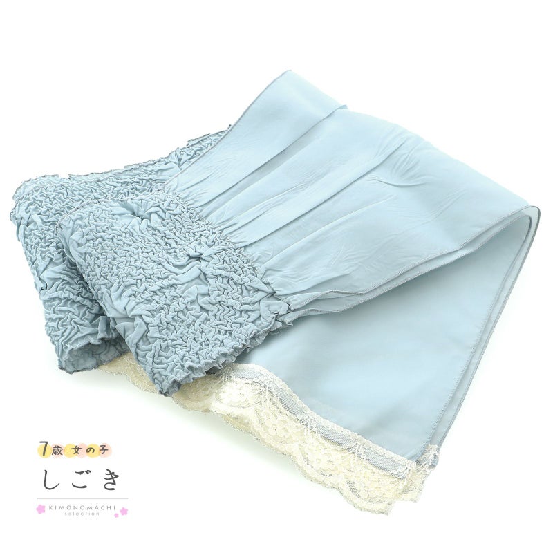 帯揚げとしごきはランダムな絞りを施したややグレイッシュな淡いブルーの地。