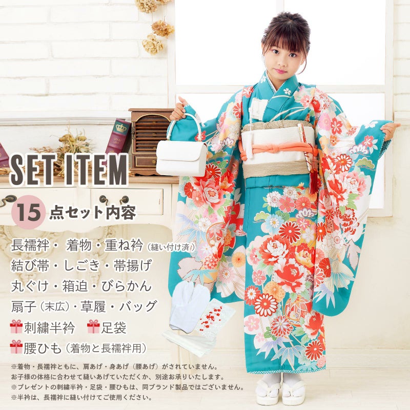 【商品内容】長襦袢・着物・重ね衿(縫い付け済)・作り帯・しごき・帯揚げ・丸くげ・箱迫・びらかん・扇子(末広)・草履・バッグ・刺繍半衿(プレゼント)・足袋(プレゼント)・腰ひも3本(プレゼント)の計15点