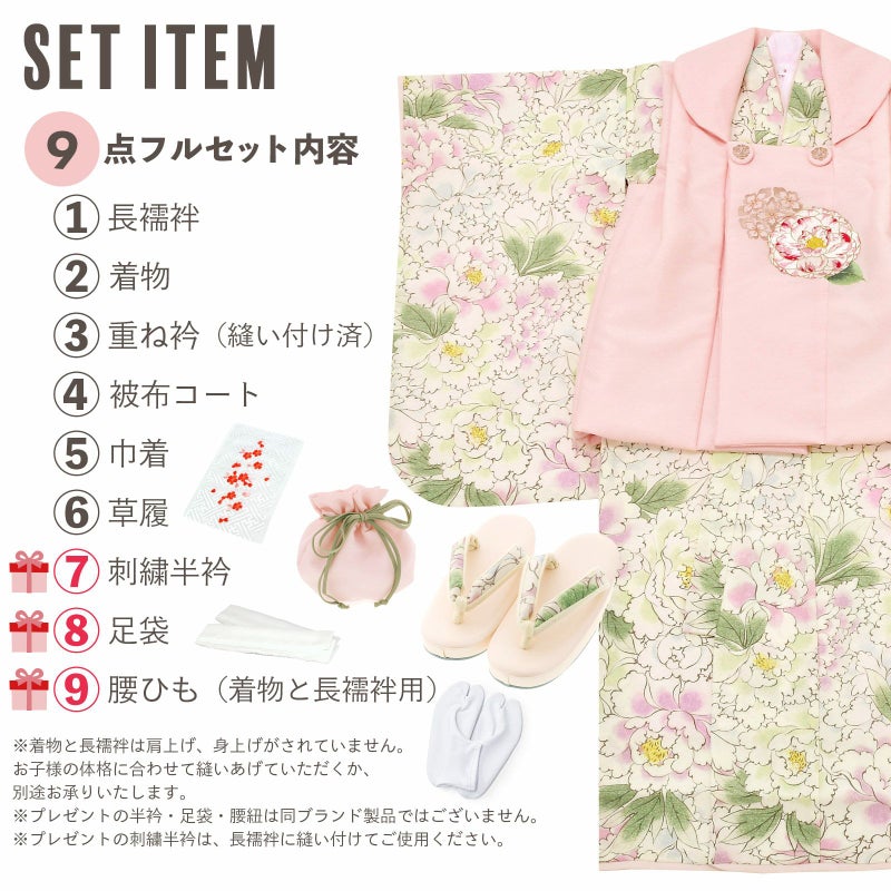 【商品内容】長襦袢・着物・重ね衿(縫い付け済)・被布コート・巾着・草履・刺繍半襟(プレゼント)・足袋(プレゼント)・腰ひも2本(プレゼント)の計9点