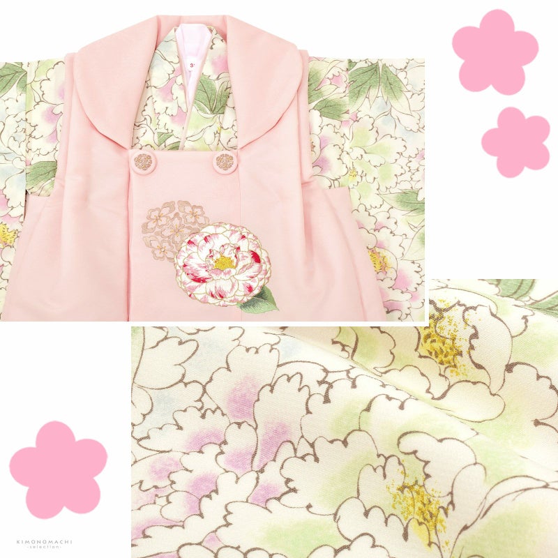 女の子の七五三に!3歳から着られる被布セットです。お着物には重ね衿が縫い付けられています。豪華で女の子らしく華やかなデザイン。七五三だけでなく、お正月やひな祭りの節句にも。