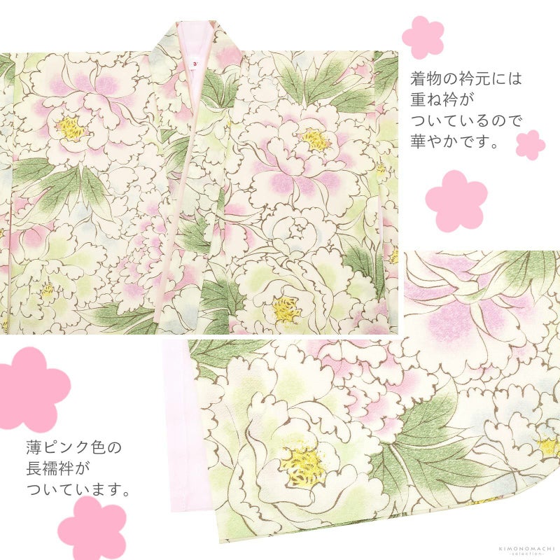 被布コートは淡いピンクの地に白にピンク、紅色の乙女椿の刺繍。グレージュの花菱が身頃とくるみボタンにも刺繍されています。着物はわずかにくすんだオフホワイトの地。グレージュの線に、ピンク、薄紫、水色、薄緑の牡丹の花々。深緑の葉。黄色の蕊に金彩が施されています。重ね衿は淡いネールピンク。草履は淡いピンクの台に、着物と共布の鼻緒。巾着は淡いピンクの袋に灰緑の紐。芸艸堂所有の格調高い図案をモダンに仕上げた被布セットです。