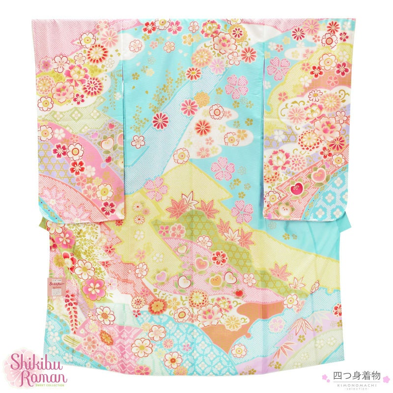 着物は明るい水色地にピンクやレモンイエロー、黄緑色、藤色などで松菱取りや道長、雲取り、雪輪取りなど色々な取り方を組み合わせた文様取り。中は疋田や籠目、七宝など。その上にやわらかいピンクや淡い赤を基調とした梅菊、桜楓や橘、楓に金茶色の枝梅などの花紋が散らされています。ポイントに金糸の刺繍。重ね衿は白。薄ピンクの長襦袢。