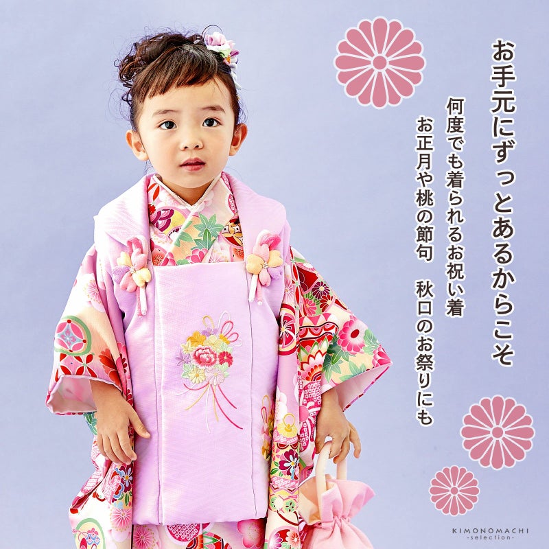 女の子の七五三に!3歳から着られる被布セットです。お着物には重ね衿が縫い付けられています。オシャレで女の子らしく華やかなデザイン。七五三だけでなく、お正月やひな祭りの節句にも。