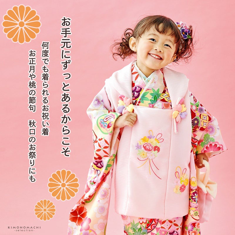 女の子の七五三に!3歳から着られる被布セットです。お着物には重ね衿が縫い付けられています。オシャレで女の子らしく華やかなデザイン。七五三だけでなく、お正月やひな祭りの節句にも。