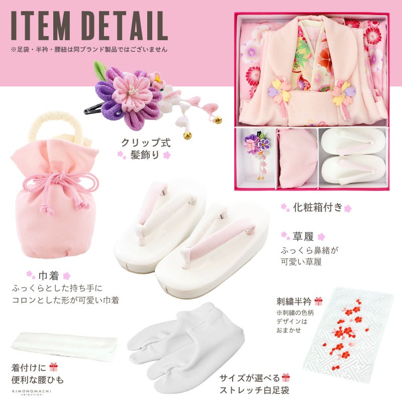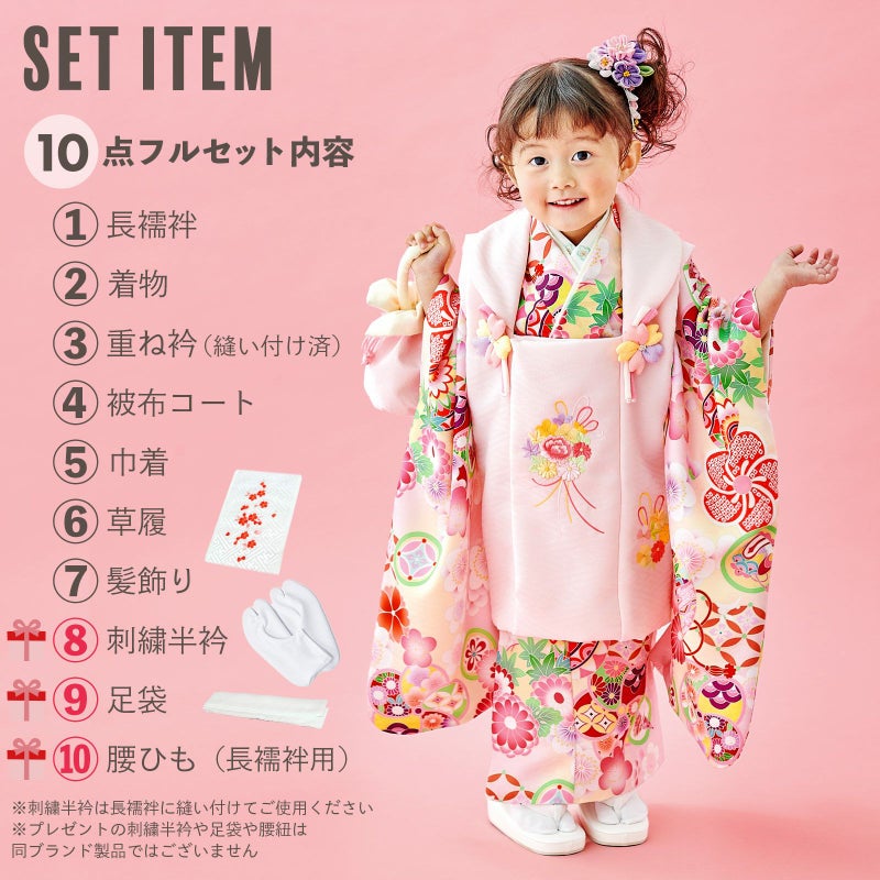 【商品内容】長襦袢・着物・重ね衿(縫い付け済)・被布コート・巾着・草履・髪飾り・刺繍半襟(プレゼント)・足袋(プレゼント)・腰ひも1本(プレゼント)の計10点