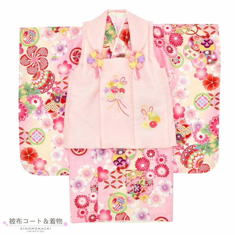 【色柄】被布コートは淡いピンクの地にピンクや黄色、薄緑色の花くす玉の刺繍。薄ピンクや黄色のつまみの桜の被布飾り。着物は地模様のある明るい薄ピンクに淡いクリーム色の縦ぼかし。ピンクや赤、黄色、紫、緑などの配色の鈴や手鞠、花紋。錆朱色の七宝や小さな白ウサギなど。重ね衿はオフホワイト。薄ピンクの長襦袢。草履は白の台に薄ピンクと白の片ぼかしの鼻緒。巾着は淡いピンクの袋にアイボリーの見返しと持ち手。ピンクやパープル、白のつまみのお花の髪飾り。