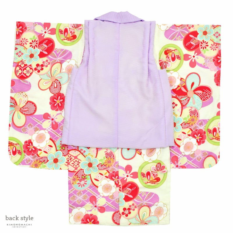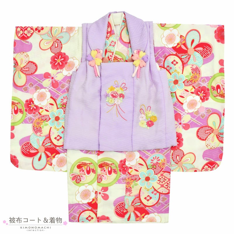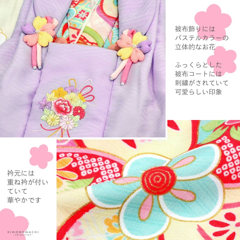 【色柄】被布コートはややグレイッシュな淡いパープルの地にピンクや黄色、薄緑色の花くす玉の刺繍。薄ピンクや黄色のつまみの桜の被布飾り。着物は地模様のあるオフホワイト地に明るい紫の霞取りと花菱。薄黄色やピンク、水色を基調としたねじ梅や花紋、丸紋など。重ね衿はオフホワイト。薄ピンクの長襦袢。草履は白の台に薄ピンクと白の片ぼかしの鼻緒。巾着は淡いピンクの袋にアイボリーの見返しと持ち手。ピンクやパープル、白のつまみのお花の髪飾り。